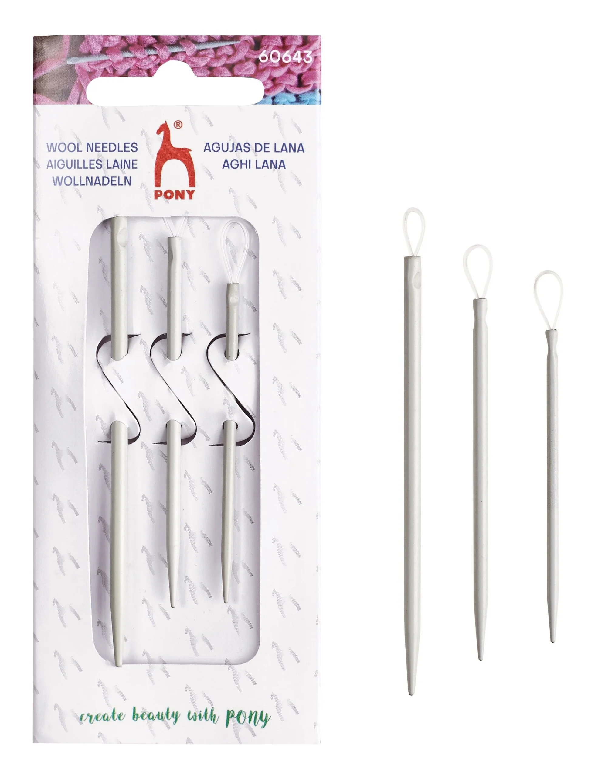Aiguilles à Laine de Pony en Aluminium. Le paquet contient 3 pièces dans les tailles 7, 8 et 9,5 cm. Les aiguilles laine ont de gros chas, elles sont donc faciles à enfiler, elles sont aussi très efficaces pour le crochet ou le tricot lâche et sont donc recommandées pour tricoter sur des aiguilles à 3,5 et plus.